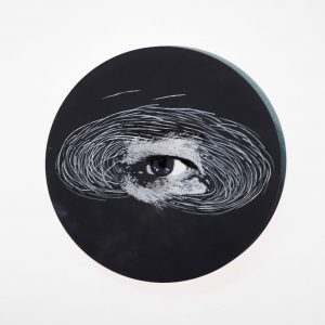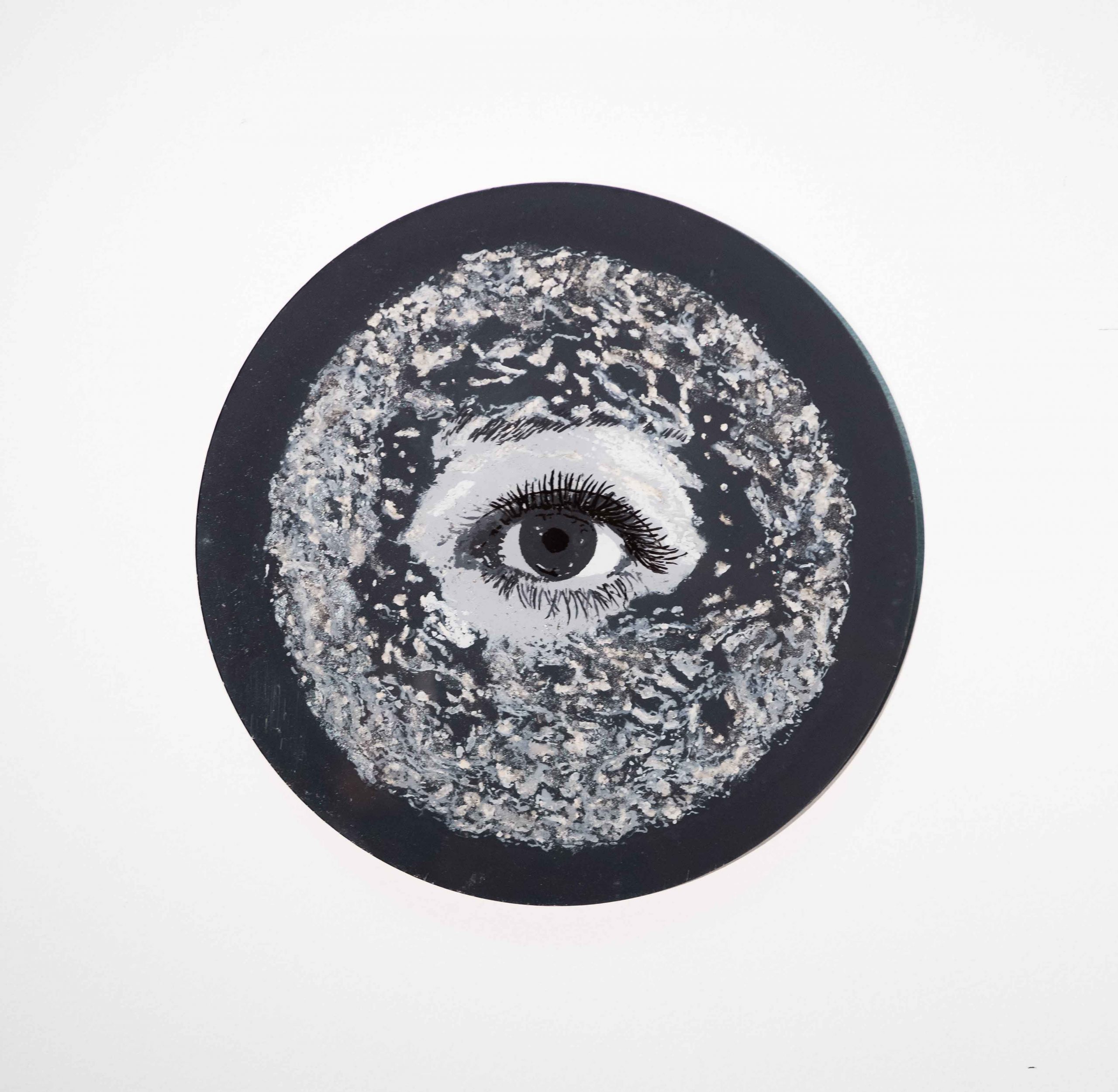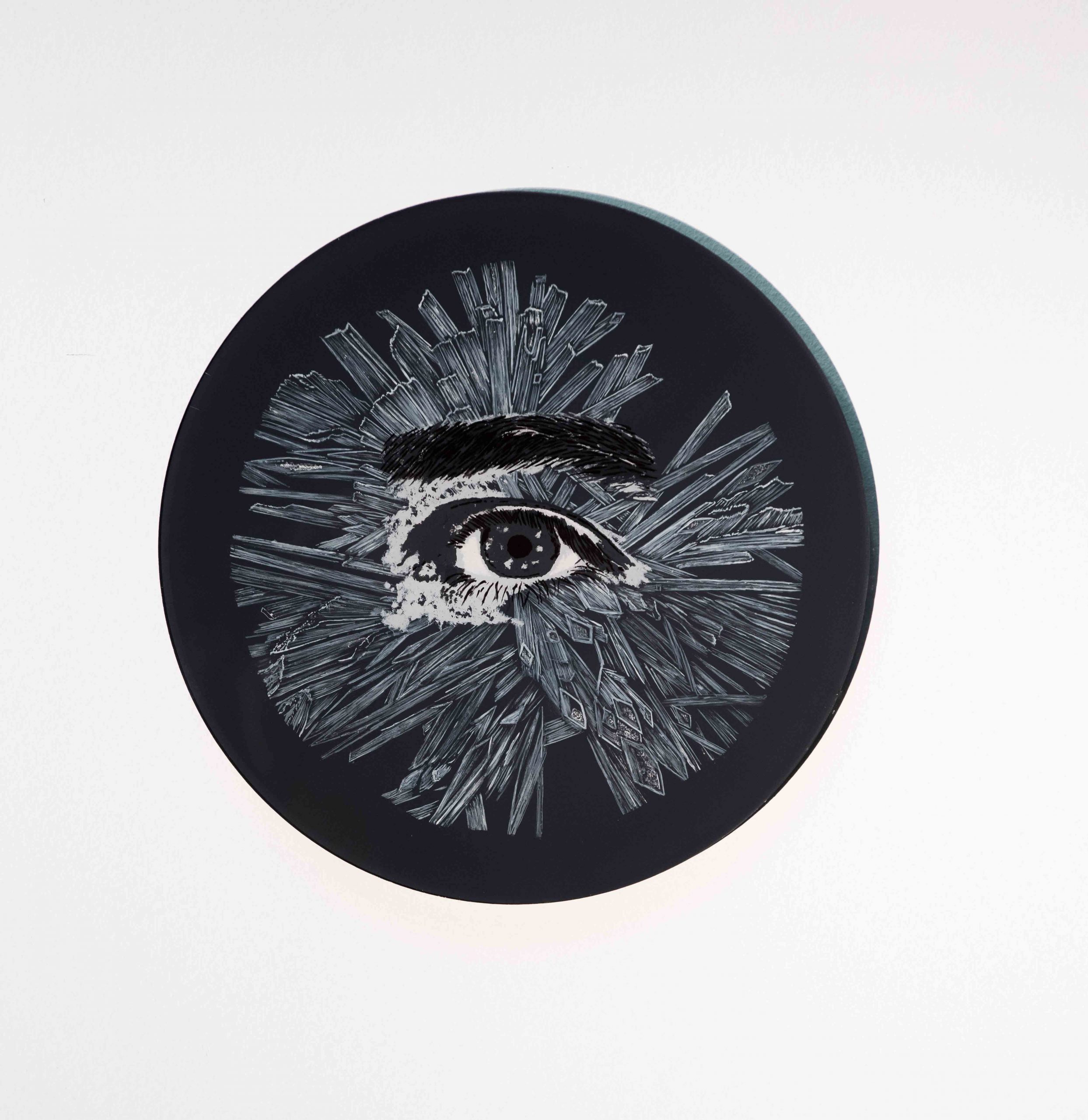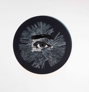 Eiko is pleased and challenged by her signature material’s counterintuitive post-industrial delicacy — which she perceives to optically and energetically unite feminine and masculine qualities into itself, especially once it’s been transformed by Eiko’s emotional, raw, organically abstract painting. This element of her composition counterbalances, both employing and subverting the transparent perfection of the plexi with its fractal embellishments. “Total perfection is not the goal,” she remarks. “After all, is anything perfect in this world? Or in this life?” This in her view is the essential magic of life, given material expression.