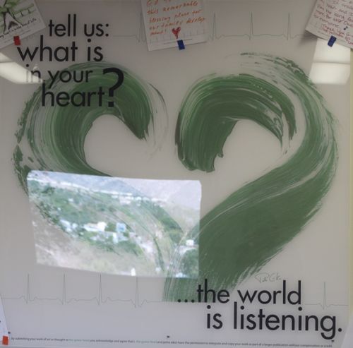 In 2010, Eiko took the-green-heart a step further by creating the public art project: what is in your heart?-the world is listening. The project was inspired by multiple trips to Dubai. She was faced repeatedly with the importance of learning and understanding others, which would ideally result in peace among all people.